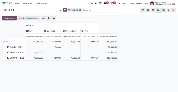 You can obtain precise data from various departments of the Odoo CRM operation using the reporting functionality of CRM modules. The reports are available and can be viewed on a variety of platforms, including Gantt, Form, Graph, and Pivot. You can also use filters in this CRM module to group or arrange data according to its properties.