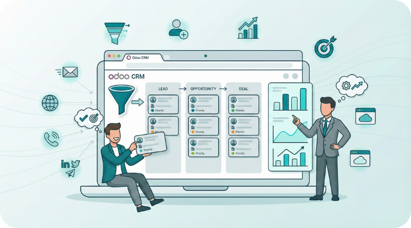 Odoo CRM helps track leads, manage sales stages, and improve customer relationships easily.