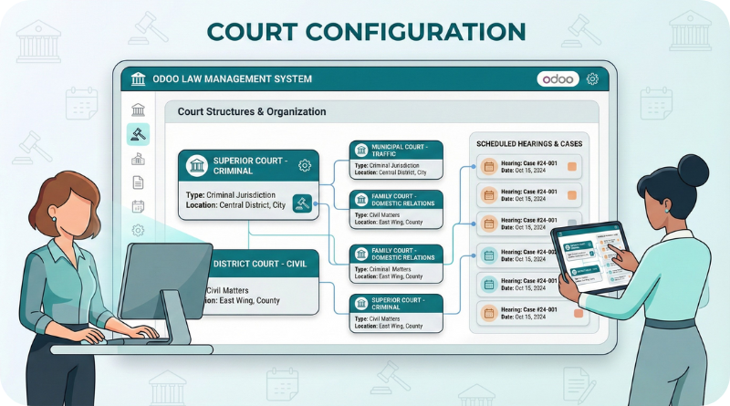 Our Odoo Law Management System allows you to configure multiple courts. This feature is essential for organizing and managing hearings and cases and providing a clear structure for analysis.