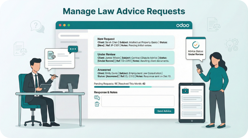 Lawyers receive various advice requests throughout their day. Our Odoo Law Management module manages client advice requests. It allows lawyers to handle and analyze these requests by referencing records and outcomes.