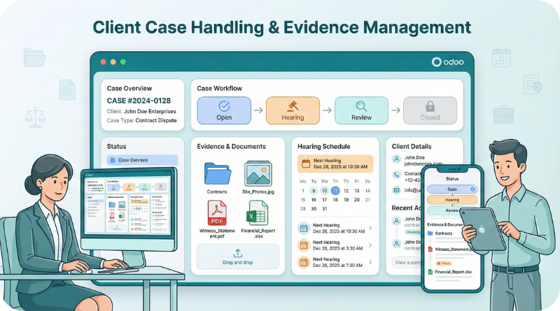 Odoo provides robust case management tools, including case tracking, task assignment, deadline reminders, and document organization. It helps law firms manage case progress, deadlines, and client communications from a centralized platform.