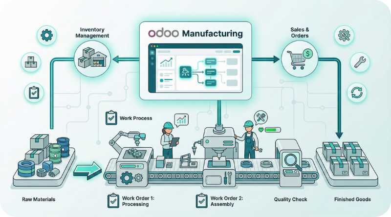 Odoo Manufacturing integrates with other Odoo modules such as Inventory, Sales, Accounting, Purchase, and Maintenance, providing a unified platform for managing all business processes.