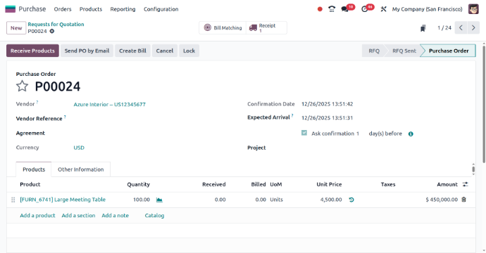 Convert RFQs into purchase orders in one click and send them to vendors by email. This makes order processing fast and smooth.