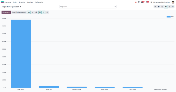 Graph View in Odoo shows purchase data in simple charts. It helps users understand spending trends and vendor performance easily.