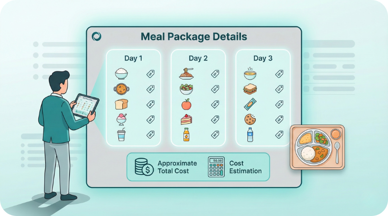 Meal Package details provide a comprehensive breakdown of the meal plan, including daily food items, their prices, and the approximate overall cost. This information helps customers understand the offerings and make informed decisions about their catering choices.