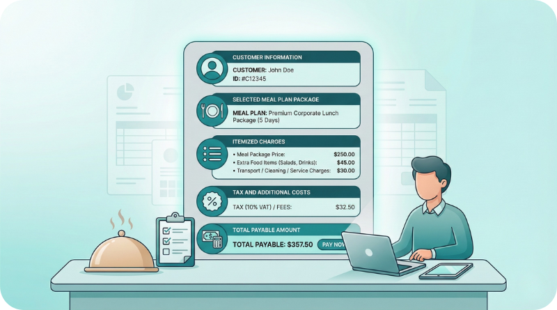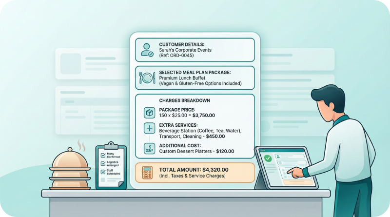 A catering order includes detailed information about the customer, selected meal plan package, associated charges, and any additional costs. This comprehensive order generation ensures accurate billing and seamless coordination of catering services.