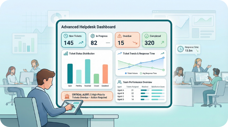 Advanced Dashboard provides an overview of every happening at your helpdesk- ticket count, charts, and tables will give you a quick view to understand what needs your attention. You can see exactly how many tickets are new, in progress, overdue, or completed. Managers will gain a better understanding of team performance, trending tickets, and response time. These insights will help plan workloads and resolve issues faster. In fact, the dashboard makes your helpdesk more organized because you do not have to search for different data manually. Everything is available at a glance, making decision-making easier and enhancing overall customer support quality.