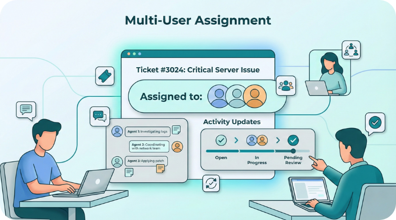 Sometimes a support issue requires more than one person to work on it. With Multi-User Assignment, you can assign a ticket to multiple team members simultaneously. This is useful for complex problems that need input from different departments. Each assigned user can update the ticket, add notes, and help in solving the issue. It improves teamwork and speeds up resolution. No need to duplicate tickets or send emails manually; the system keeps everyone aligned. This feature ensures faster support, better communication, and higher-quality solutions.