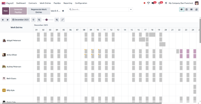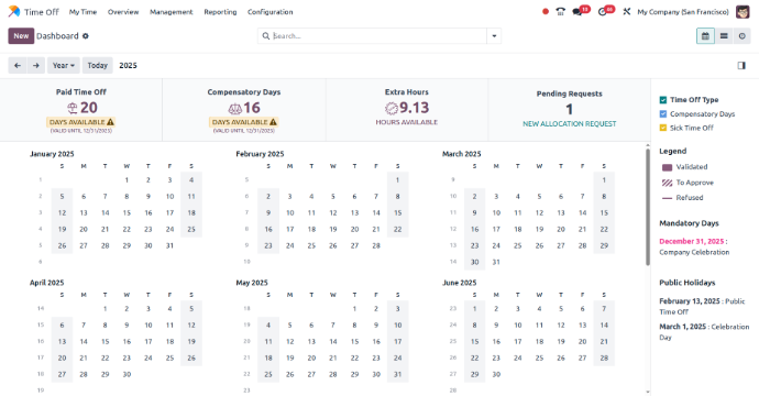 The Employee Leave Calendar in Odoo shows employee leave schedules in a clear calendar view. It makes leave planning and management easy and organized.