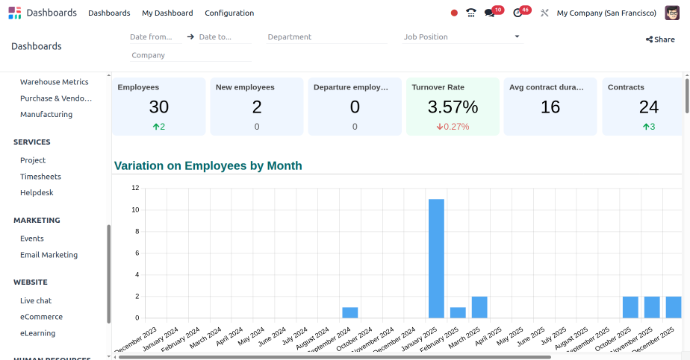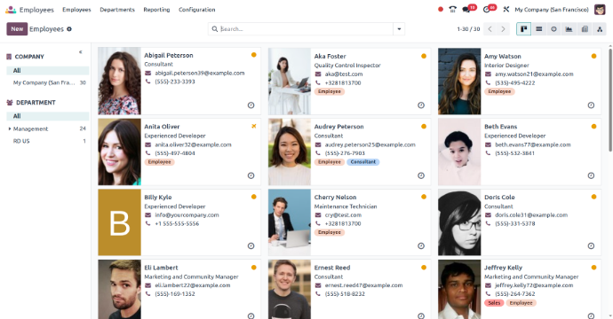 Odoo HRMS is integrated with Accounting, Payroll, and other modules. This ensures data stays connected and always up to date.