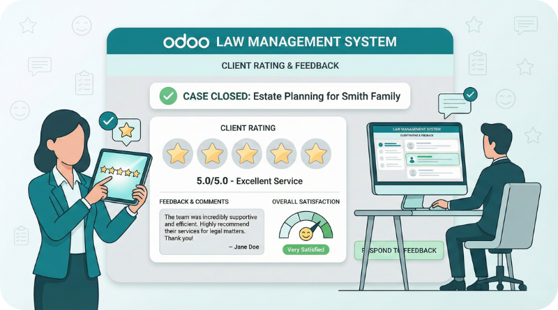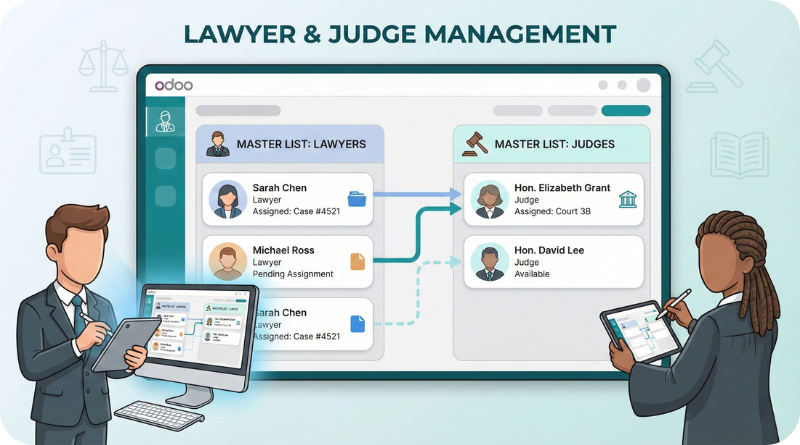Odoo Law Management Software law firm by case information, collaboration among team members, and automating administrative tasks. It firms to deliver quality legal services and optimize productivity.