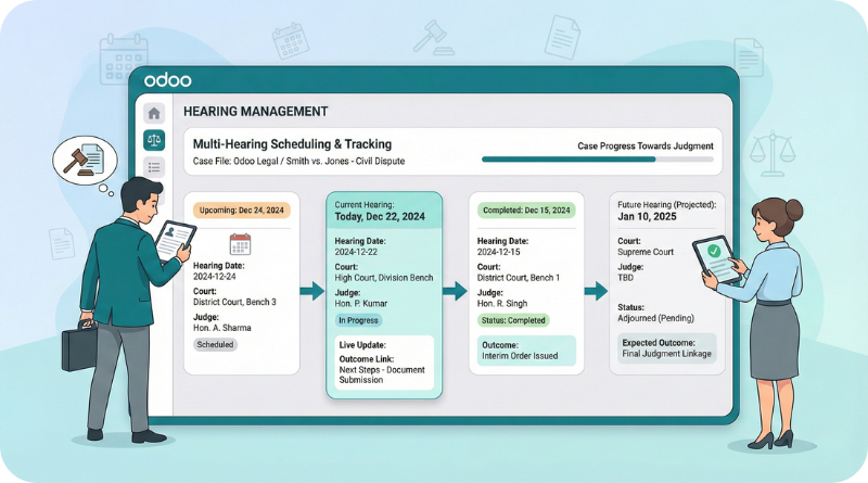 Cases can originate from any client, and our system ensures that lawyers and clients can manage these cases. The Odoo Law Case Management system provides a structured workflow for each case, allowing lawyers to document evidence, schedule hearings, and track the case's progress from start to finish.