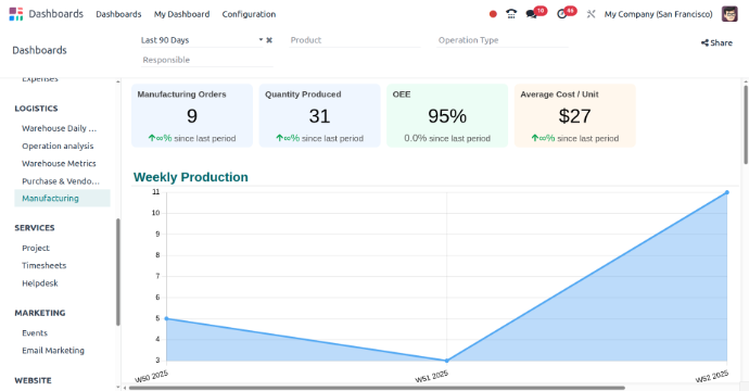 The MRP Dashboard in Odoo provides a comprehensive overview of manufacturing operations, helping users manage and optimize production processes.