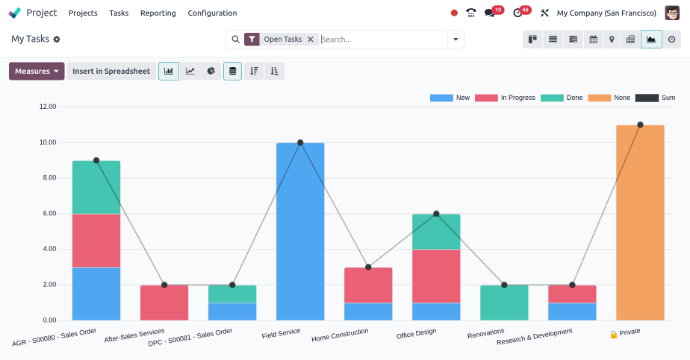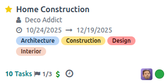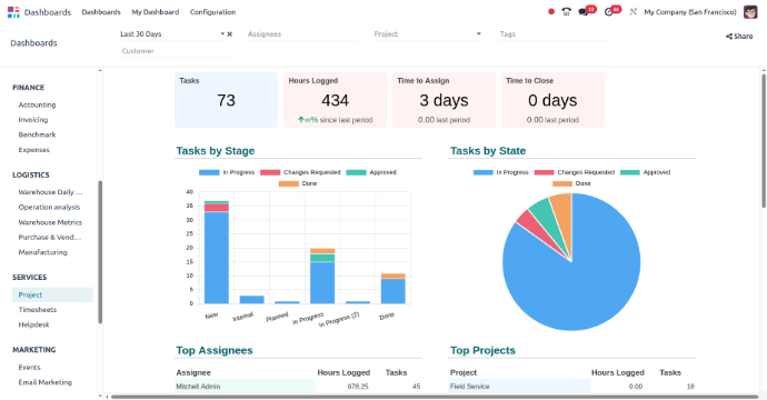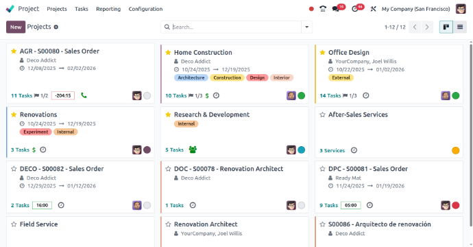 Odoo allows users to manage many projects, each with its tasks, settings, and teams. You can switch between projects and get an overview of all projects from the dashboard.