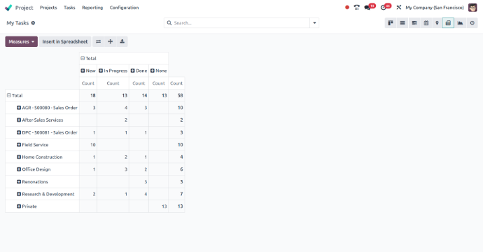 The Task Pivot View in Odoo offers a powerful way to analyze task data using a tabular format, providing detailed insights into project performance