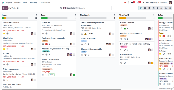 Odoo Project is linked with Sales, Accounting, and HR modules. This keeps data accurate and avoids duplicate work.